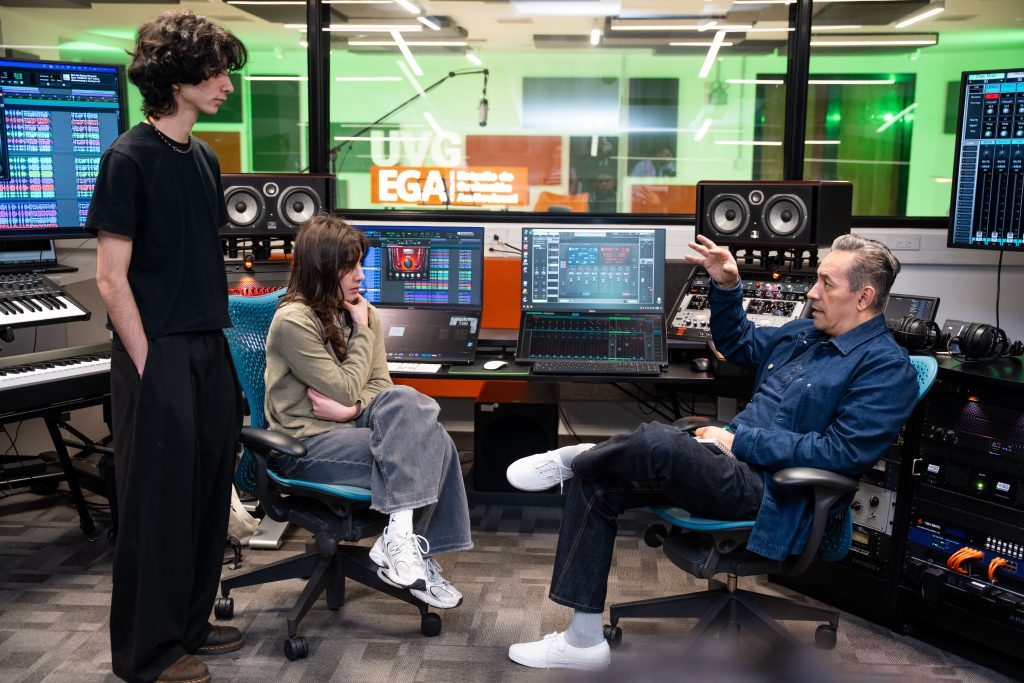 La jornada trascendió el conversatorio y se complementó con una sesión de estudio exclusiva en el Estudio de Grabación Audiovisual (EGA) de UVG. En este espacio, un grupo selecto de participantes, varios de ellos becados por el patrocinador Do Mi Sol, tuvo la oportunidad única de presentar sus demos y recibir retroalimentación personalizada del galardonado productor.