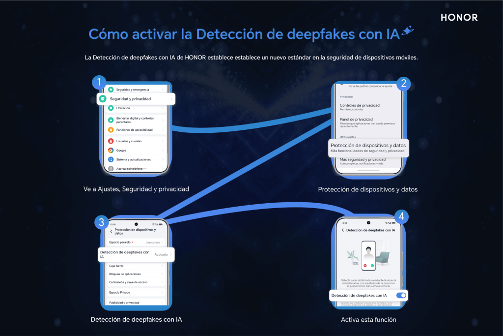 La inteligencia artificial del HONOR 400 realiza un análisis en tiempo real de imágenes y videos, buscando artefactos y anomalías que puedan indicar una alteración digital. El sistema está entrenado para detectar micro-expresiones inconsistentes, parpadeos irregulares, texturas de piel sintéticas o desajustes en la sincronización labial.