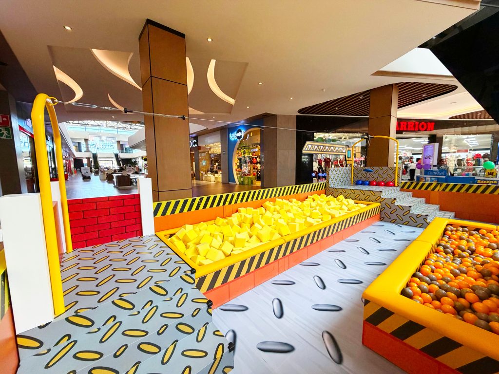 Lo que destaca de esta amenidad es su diseño visual. Alejándose de los colores genéricos, el área utiliza una paleta de amarillos, naranjas y grises, simulando una obra real en proceso.